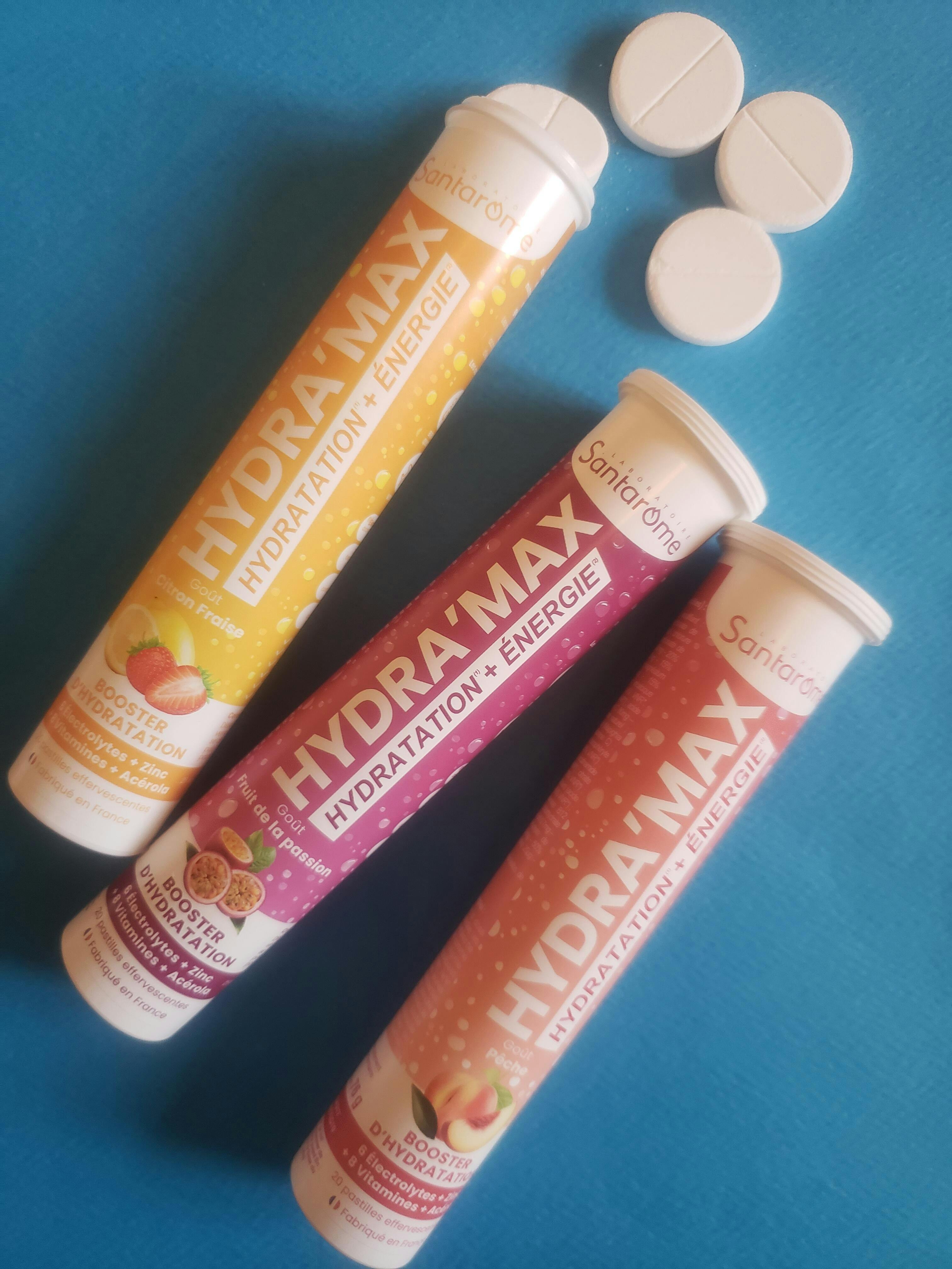 The main purpose of hydration tablets is to compensate for electrolyte loss and maintain a good level of hydration on a daily basis. Pastilles can be beneficial if you have cramps or muscle soreness. At Santarome, our Hydra'Max pastilles go even further by offering a real energy boost thanks to a complex of vitamins and acerola.