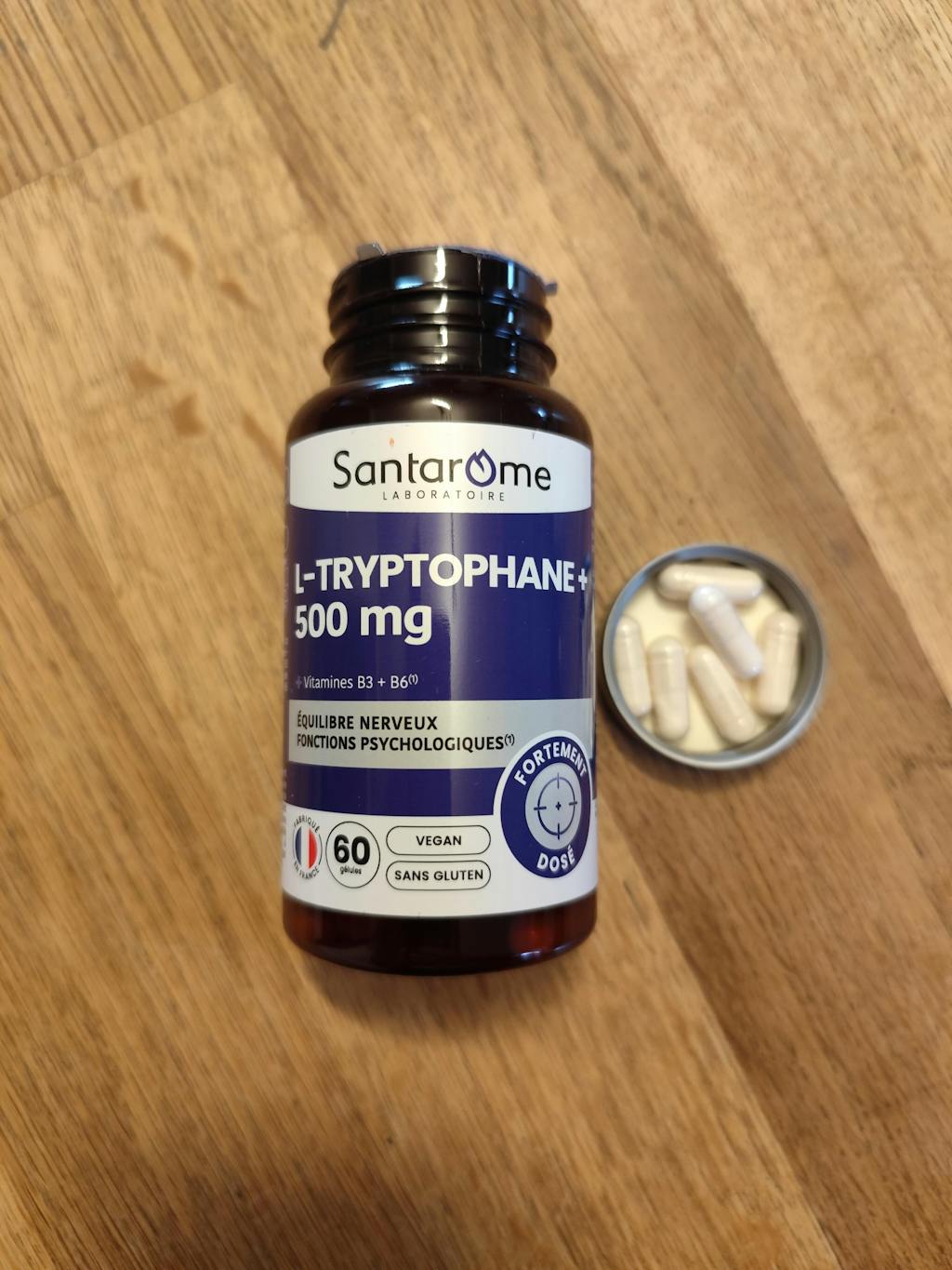 Le L-Tryptophane, sélectionné par Santarome, est dosé à 500 mg.