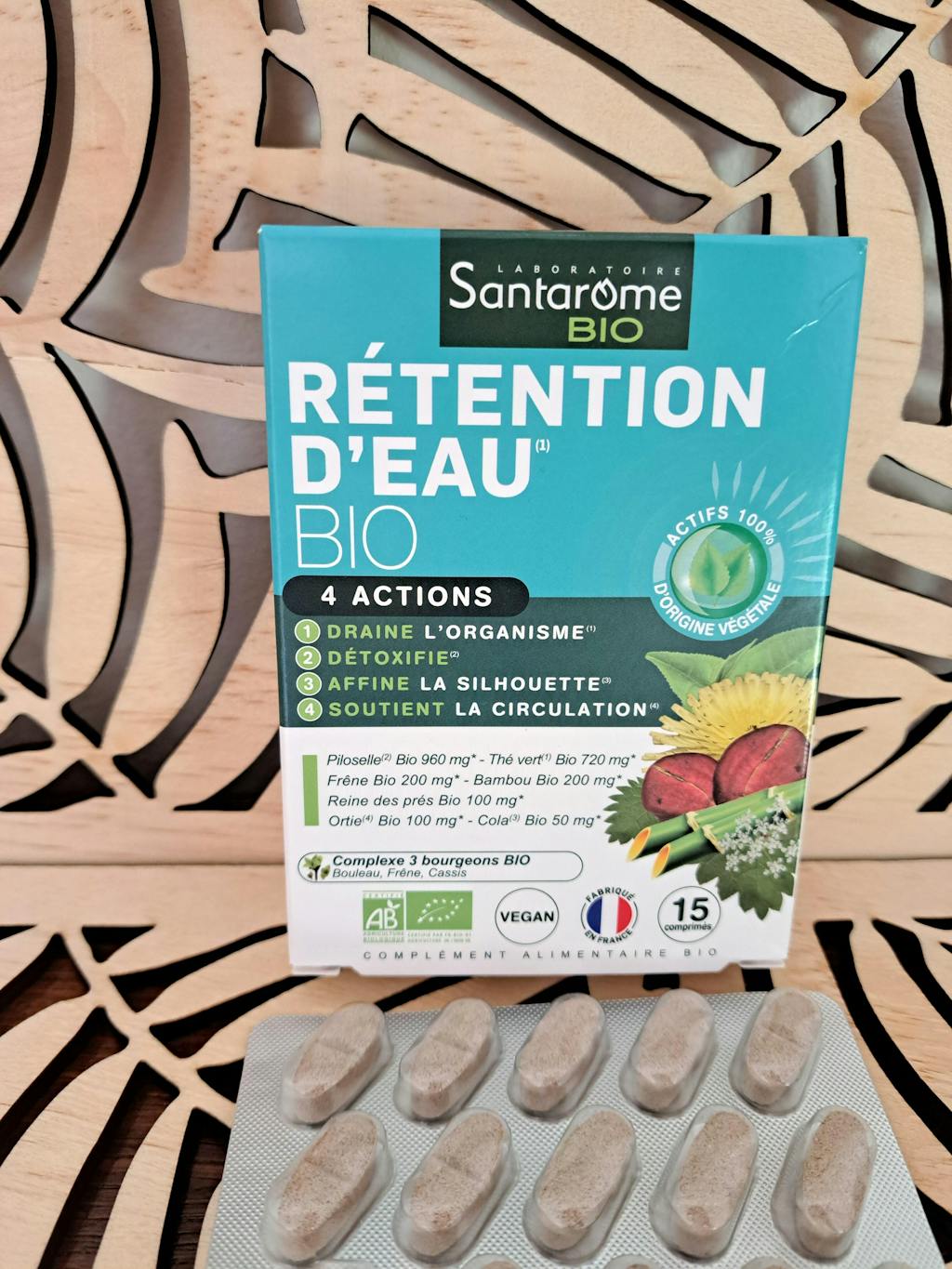 After a 15-day course of dietary supplements for water retention from Santarôme Laboratories, taking one tablet with a large glass of water at breakfast, I feel like my legs are a little lighter. I feel a little less bloated and more free. Made from 100% plant-based active ingredients including hawkweed, green tea, meadowsweet, nettle, bamboo, cola, and ash, as well as a complex of three organic buds (birch, ash, and blackcurrant), I feel completely confident about what I am consuming.