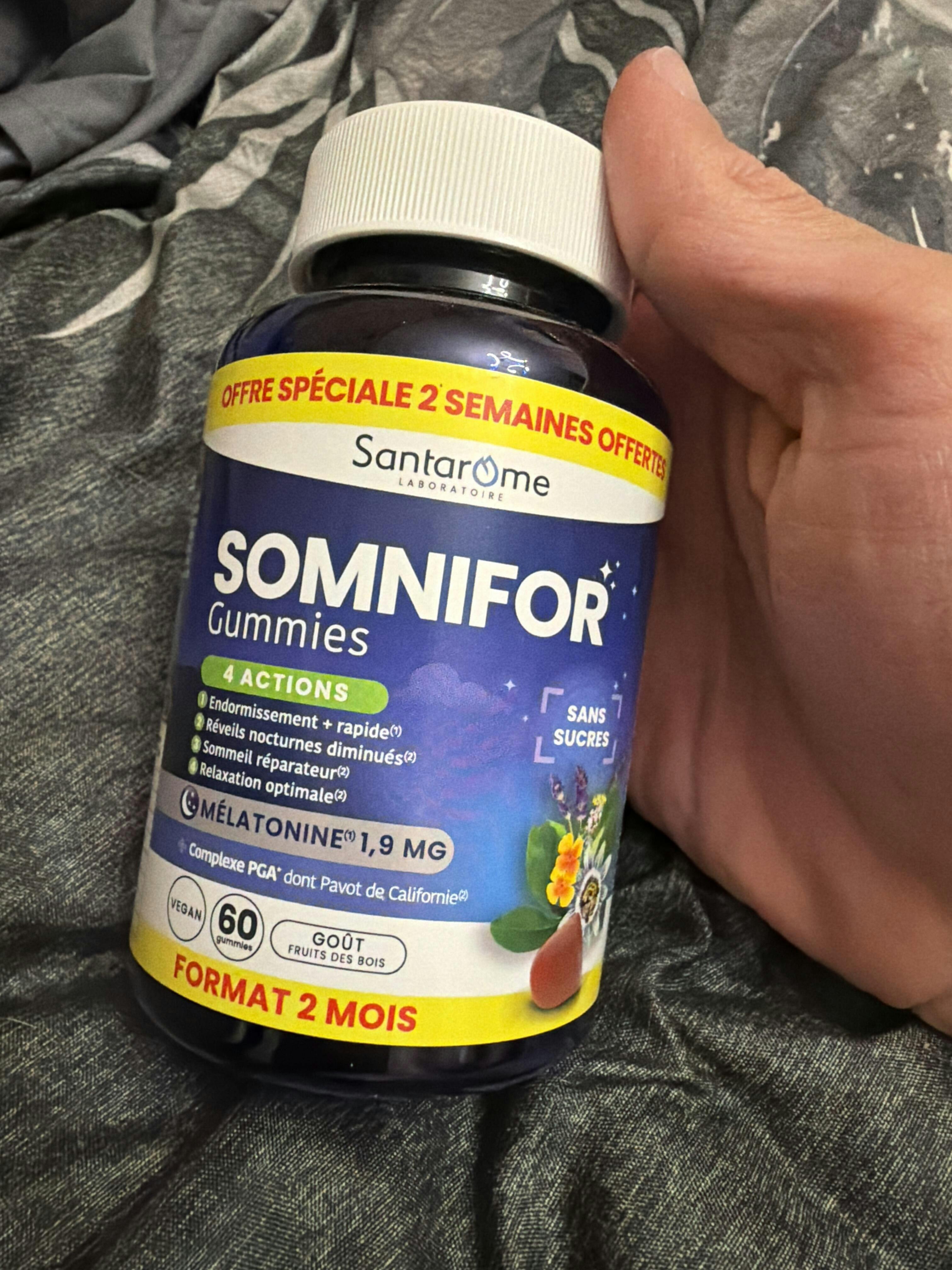 INGREDIENTS: bulking agent: maltitol - acidity regulator: citric acid - dry extract of aerial parts of California poppy (Eschscholzia californica Cham.) - gelling agent: pectin - glycerinated macerate of hawthorn bud (Crataegus laevigata L.), glycerinated macerate of linden bud (Tilia platyphyllos Scop.), glycerinated macerate of fig (Ficus carica L.) - dry extract of valerian root (Valeriana officinalis L.) - dry extract of aerial parts of passionflower (Passiflora incarnata L.) - natural flavouring - acidity regulator: sodium citrate - carrot and blackcurrant concentrate - antioxidant: tocopherol-rich extract - coating agent: carnauba wax - melatonin - essential oil of lavender flower tops (Lavandula angustifolia Mill.)