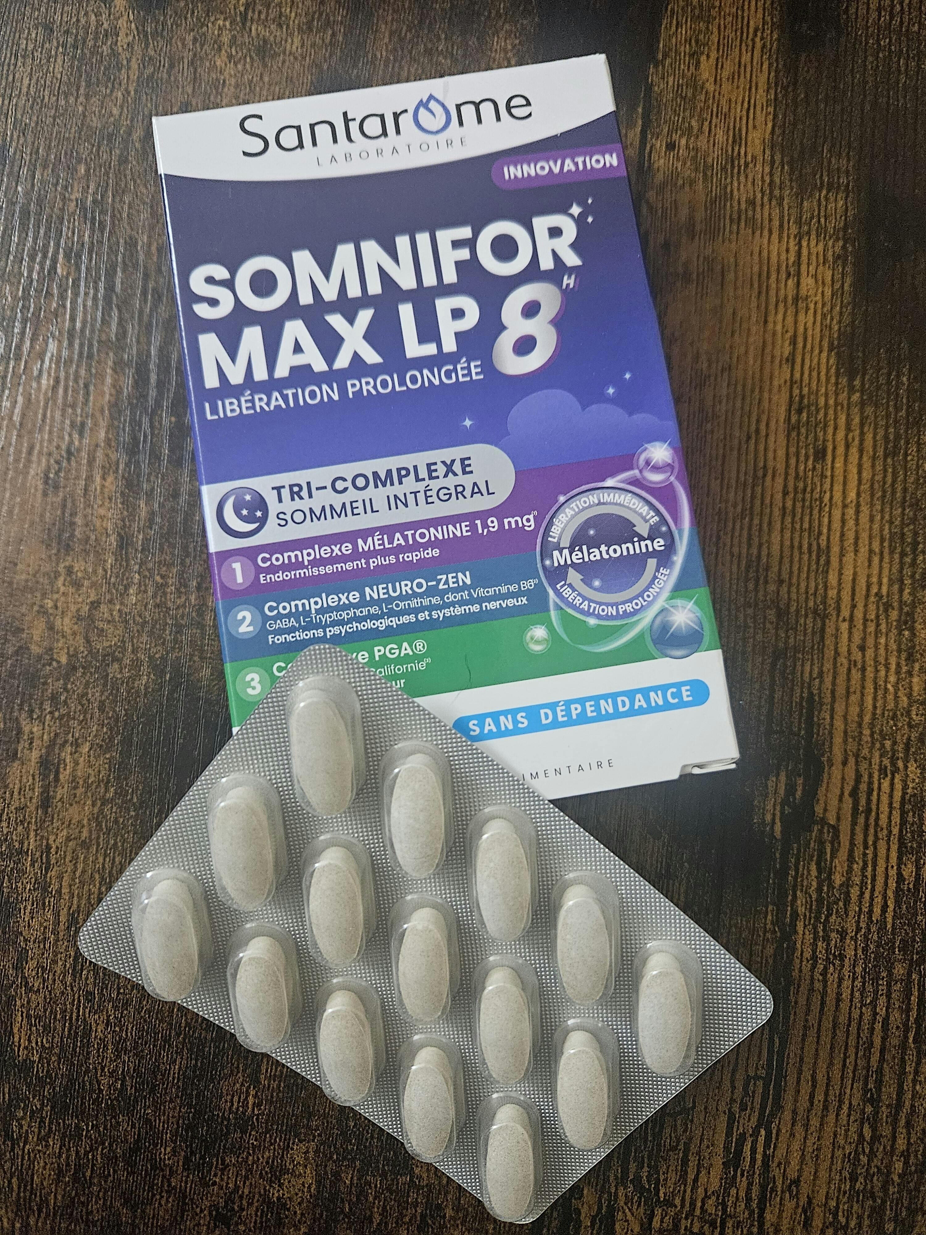 INGRÉDIENTS : agent de charge : cellulose microcristalline, extrait sec de pavot de Californie (Eschscholzia californica Cham.), anti-agglomérant : phosphates de calcium, chlorhydrate de L-Ornithine, L-Tryptophane, Acide gamma-aminobutyrique (GABA), macérats glycérinés [eau, glycérine, alcool, bourgeon d’aubépine à deux styles (Crataegus laevigata (Poir.) DC.), bourgeon de tilleul à larges feuilles (Tilia platyphyllos Scop.), bourgeon de figuier (Ficus carica L.)], anti-agglomérant : sels de magnésium d’acides gras, mélatonine, vitamine B6 (chlorhydrate de pyridoxine), huile essentielle de Lavande (Lavandula angustifolia Mill.).
