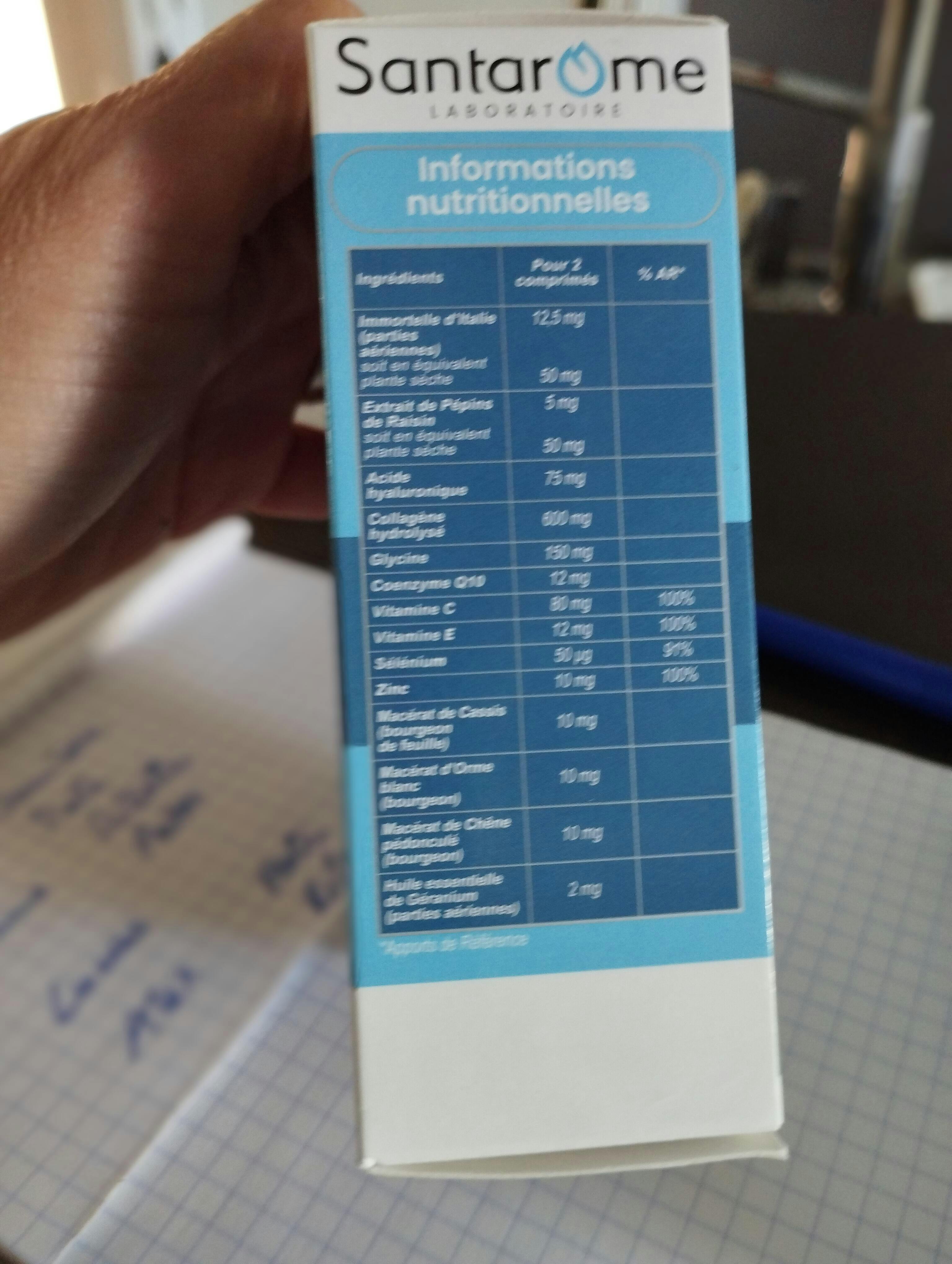 INGREDIENTS: Fish collagen hydrolysate, bulking agent: acacia gum, anti-caking agents: calcium phosphates, magnesium carbonate, glycine, vitamin C (L-ascorbic acid), zinc gluconate, sodium hyaluronate, vitamin E (DL-alpha-tocopheryl acetate), selenium-enriched yeast, dry extract of Italian Helichrysum (Helichrysum italicum (Roth.) G. Don), Coenzyme Q10 (ubiquinone), glycerin macerates [water, glycerin, alcohol, blackcurrant leaf bud (Ribes nigrum L.), white elm bud (Ulmus glabra Huds.), pedunculate oak bud (Quercus robur L.)], anti-caking agent: magnesium salts of fatty acids, dry extract of grape seeds (Vitis vinifera L.), geranium essential oil (Pelargonium graveolens L'Hér.).